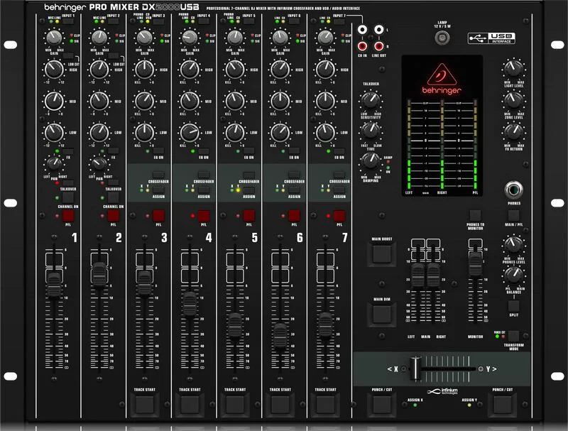 mixpult pro DJ, 7 kanálů, phantom, LED indikace gain and přebuzení, USB audio interface, 100 mm fadery, bezdotykový 45 infinium mm VCA Crossfader, možnost instalace do 19″ racku, rozměry 483 x 355 x 160 mm, hmotnost 6.7 kg