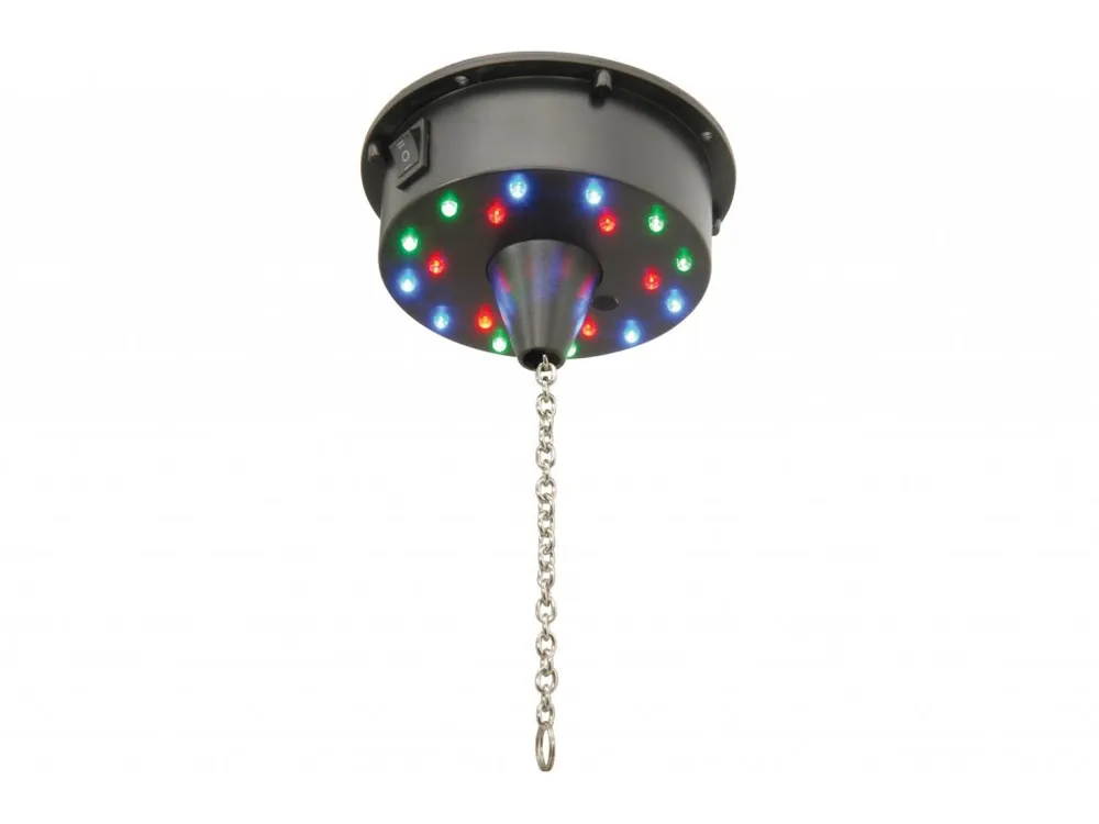 Velmi tichý bateriově poháněný motor pro zrcadlové koule do 3 kg. Obsahuje 18 RGB LED diod pro vytvoření úžasného světelného efektu. Možnost statické nebo pomalé změny barevného spektra.