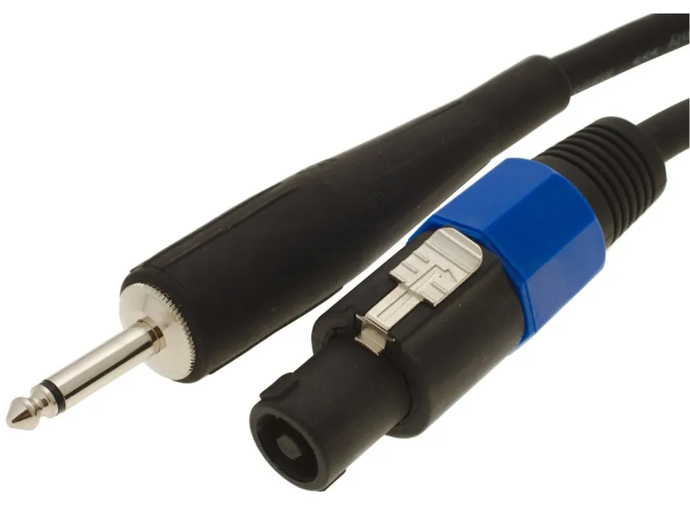 Reproduktorový silový kabel série Python. Kabel sestává z gumového jumbo jack konektoru, reproduktorového konektoru a super nehlučného kabelu.