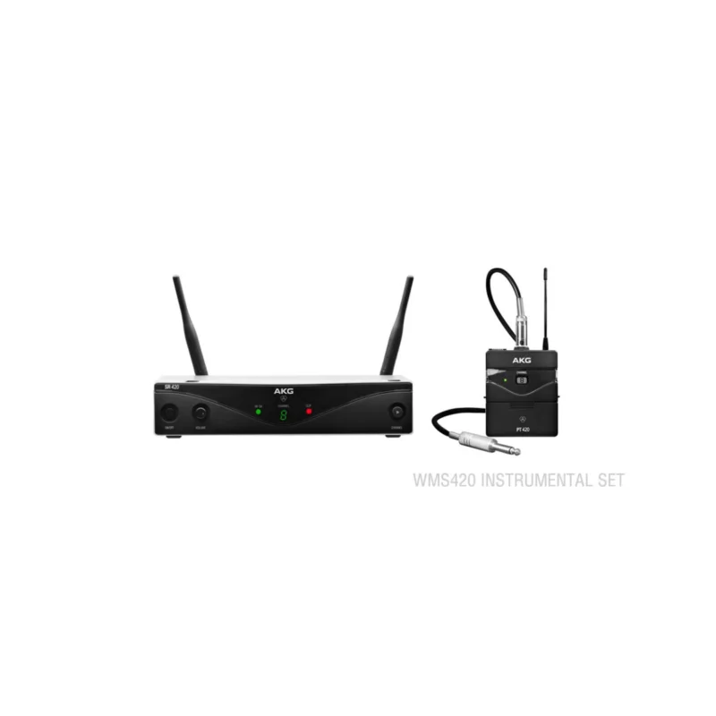 WMS420 Instrumental je bezdrátový nástrojový set značky AKG určený pro kytaru, baskytaru a nástrojové mikrofony. Komplet pracuje na přenosových frekvencích 606,1 – 613,7 MHz a je složený z přijímače SR420, body-pack vysílače PT420 a nástrojového kabelu MKG L. Uplatní se všude, kde jsou kladeny vysoké požadavky na spolehlivost přenosu a maximální čistotu zvuku. Minimum ovládacích prvků umožňuje snadné zprovoznění celého systému, kompaktní rozměry a nízká hmotnost vysílače zaručují uživateli neomezenou mobilitu.