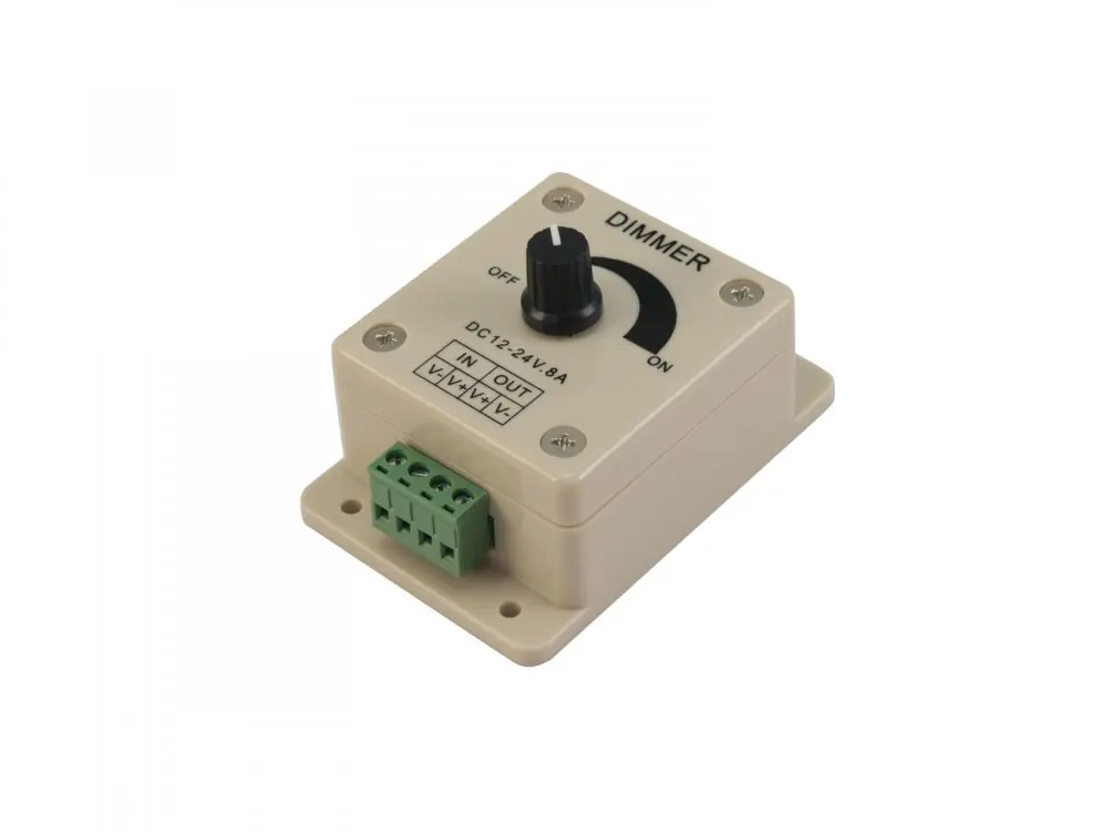 1-kanálový ovladač pro jednobarevné 12-24V LED pásky. Jednoduchý stmívač pro ovládání jasu. Připojení napájení a LED pásky pomocí terminálu se šroubovacími svorkami.