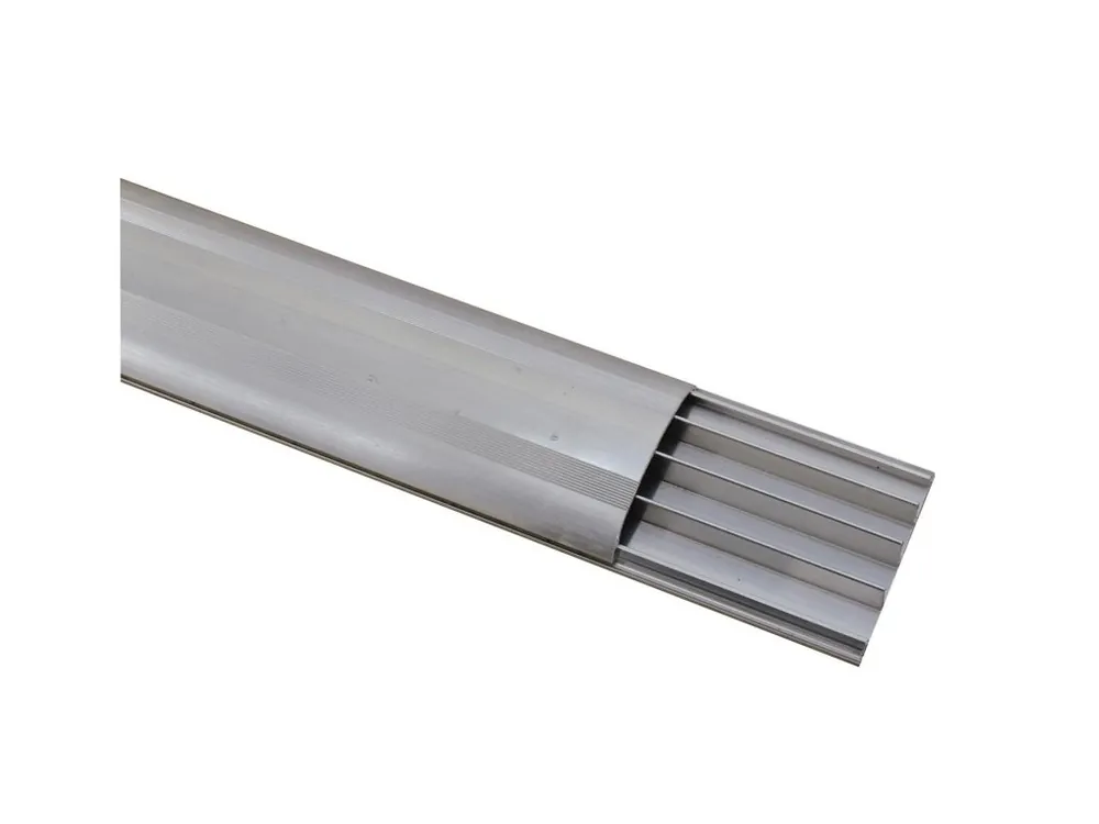 Rugged floor cable channelMaterial: aluminumDimensions: W: 75 mm, H: 17 mmAvailable lengths: 2000 mmSections (for installing the cables): 4Cable run: 4 x 11 mm ? (z. B. NYM 3 x 1,5 mm?)Color: anodic silverWith slip-resistant surface on the coverWheelchairs can easily overcome the channelExtreme stabilityEasy installationLow weightFor exhibition and shop installers, discotheque and theatre installationsMade in Germany
