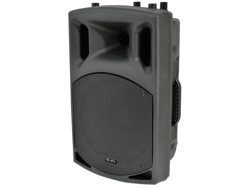 Přenosný PA 12″ mobilní zvukový systém řady QX. Vestavěný zesilovač s výstupním výkonem 50 + 50W RMS (LF + HF) napájený ze sítě nebo interního nabíjecího akumulátoru (provoz na akumulátor až 8 hodin). Součástí dodávky je 2x VHF ruční bezdrátový mikrofon (frekvence 174.1MHz + 175.0MHz), zabudovaný přijímač a zesilovač na zadní straně vč. ovládacích prvků (regulace hlasitosti, Echo efekt, korekce basů a výšek a regulace vstupní úrovně bezdrátových mikrofonů), další 2 mikrofonní vstupy a přijímač Bluetooth™ . Vstupy: linkový (AUX) / USB / SD / FM. Zasouvací rukojeť a kolečka pro snadnou manipulaci a transport. Napájení: externí – 220/240V AC, 50/60Hz, interní – zabudovaný akumulátor 12V . Výkon 12“ reproduktoru 200W RMS.