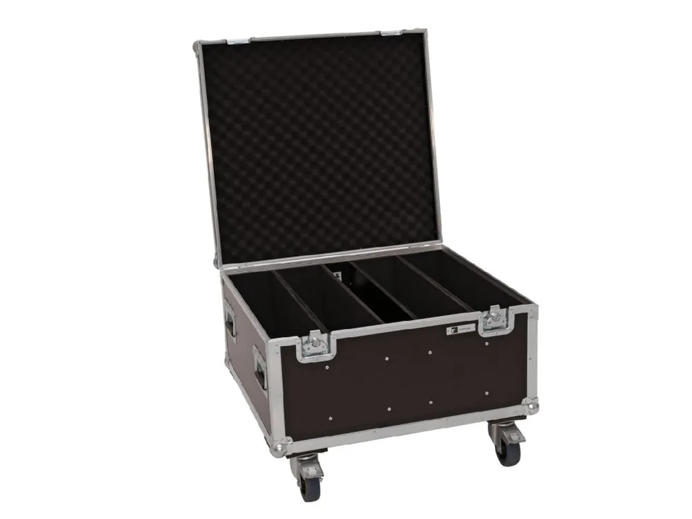 Přepravní kufr s kolečky pro čtyři reflektory Eurolite LED PLL-480 QCL (40001898).Tloušťka materiálu 7 mm, vnitřní rozměry 70 x 66 x 35 cm, čtyři přihrádky na zařízení 14 x 65,5 x 35 cm, střední přepážka pro příslušenství 8 x 66 x 35 cm, hrany z hliníkových profilů, ocelové kulaté rohy, 2x motýlkový zámek, 4x kovové sklopné ucho. Vnější rozměry (d x š x v) 74 x 71 x 52,5 cm, max. nosnost 100 kg, hmotnost 21,80 kg. Barva tmavě hnědá.