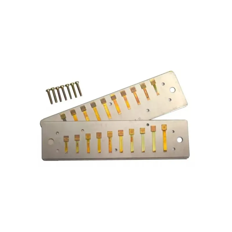 2) Povolte šrouby upevňující plátky na hřeben harmoniky a staré plátky sejměte z nástroje.