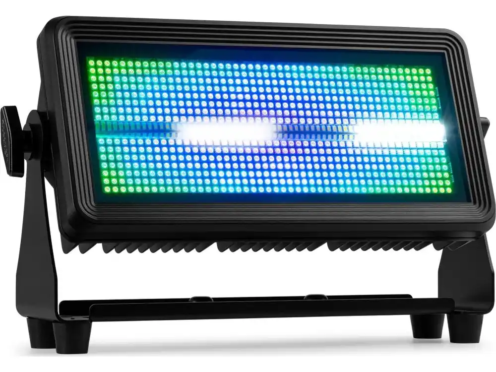 BS1100IP je výkonné víceúčelové svítidlo, které je díky 768 SMD LED diodám speciálně navrženo pro použití jako stroboskop nebo blinder. Panel LED je rozdělen na 96 sekcí a díky systému míchání RGB může blikat v libovolné barvě. Tento stroboskop je také vybaven pásem 128 bílých SMD LED uprostřed svítidla, který lze ovládat v 16 různých sekcích a vytvořit tak tradiční vzhled stroboskopu. Stroboskop BS1100IP umožňuje vytvářet jedinečné barevné efekty a jeho ovládání je snadné prostřednictvím DMX nebo v samostatném režimu s automatickou funkcí. Odolnost proti prachu a vodě s krytím IP65 zaručuje spolehlivý výkon za jakýchkoli povětrnostních podmínek. Vhodné pro všechny druhy vnitřních i venkovních show a akcí.