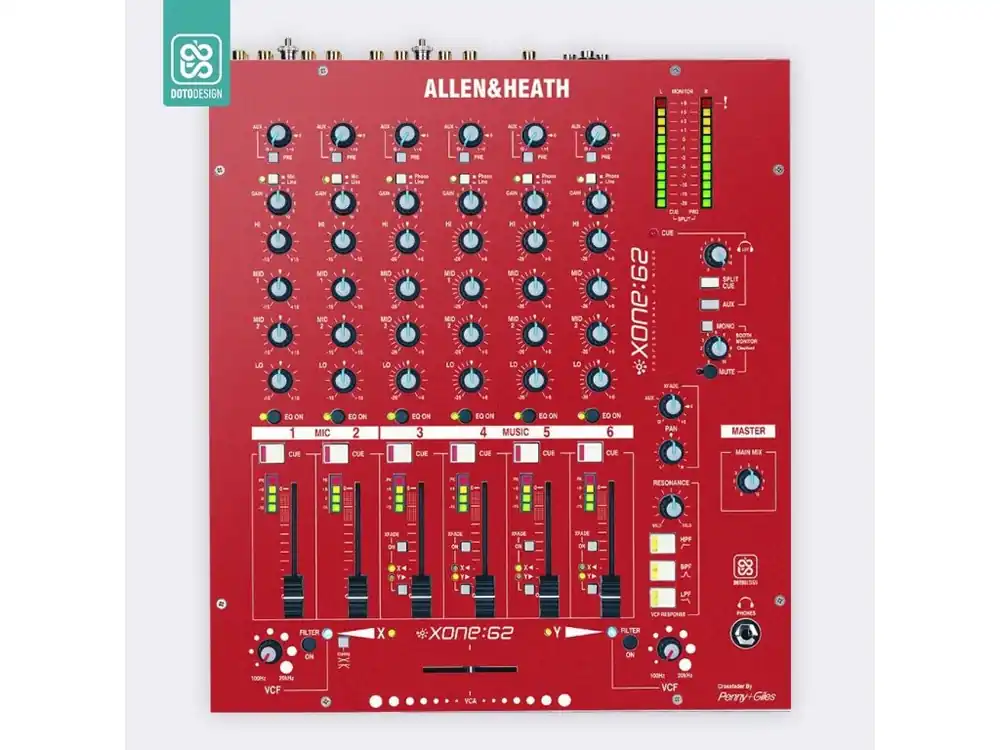 Nalepovací skin pro mixážní pult Allen & Heath XONE:62 v provedení FULL COLORS, barva aurora red (červená).