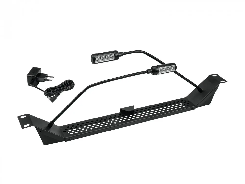 483 mm front panel for rack installation with 2 LED gooseneck lamps. Useful tool for every DJ booth. 30 cm goosenecks, can be rotated in every direction. 360 rotatable heads with super bright multicolored LEDs. Push button for on/off and color selection, with memory function. 5 different colors adjustable: red, green, blue, yellow and cold white. Clamp for fixation of the goosenecks. Low power consumption. Operation via supplied power unit.
