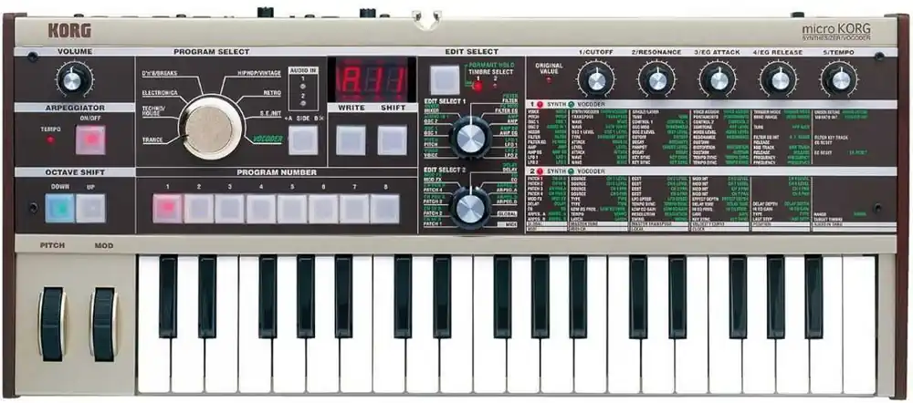 Při vytváření 128 přednastavených zvukových programů využili vývojáři firmy Korg naplno všechny možnosti, které microKORG nabízí. Zahrnují jak široké spektrum nejnovějších hudebních stylů, tak i mnoho oblíbených vzpomínek na časy minulé. Připraveno je rovněž 16 vokodérových programů. Kolečko pitch bend, modulační kolečko a pět dalších ovládacích knoflíků umožňují pohodlné a efektivní řízení různých parametrů zvuku v reálném čase (mezní frekvence fitru, náběh, uvolnění a další důležité parametry). V režimu Edit pak můžete přednastavené zvuky libovolně upravovat nebo si vytvářet vlastní zvuky.