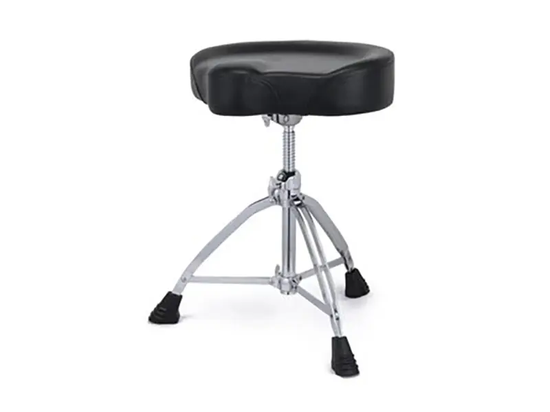 Bubenická stolička, trojnožka, dvojité nohy, šroubovice, motocyklový sedák o rozměru 17×4“ z černé umělé kůže, nastavitelná výška 480 až 635 mm