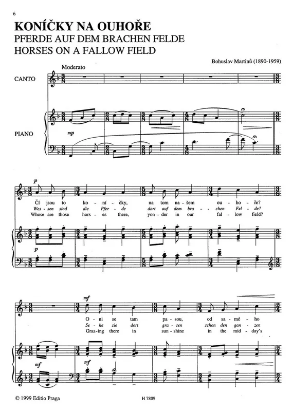 Tento sešit Vám přináší čtyři písně pro zpěv s doprovodem klavíru, které Bohuslav Martinů napsal na slova české lidové poezie. Texty písní jsou v českém, anglickém a německém jazyce.