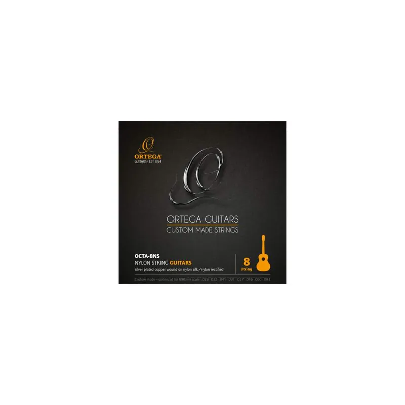 Tyto struny jsou vhodné pro klasické osmistrunné kytary Ortega s menzurou 690 mm, např. pro modely Octa Suite a RCE159-8.