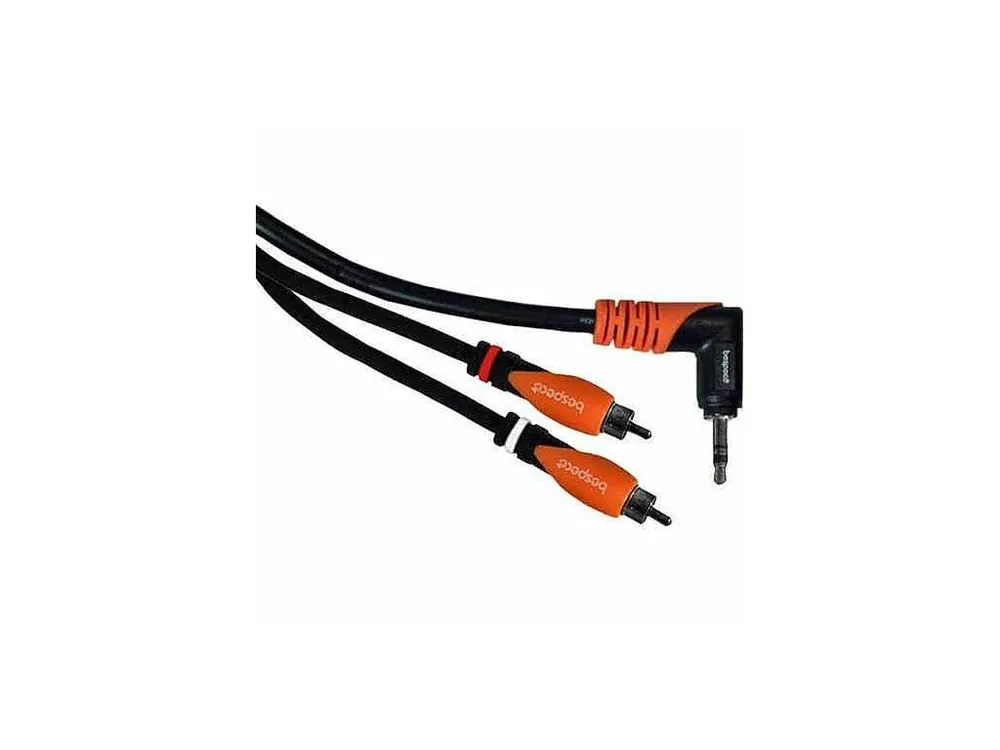 Propojovací kabel s profilovaným 90° stereo jackem 3,5 mm, dva RCA profilované konektory, stíněný kabel.