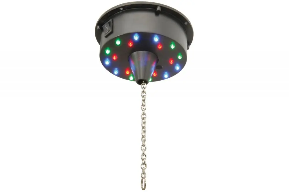 Velmi tichý bateriově poháněný motor pro zrcadlové koule do 3 kg. Obsahuje 18 RGB LED diod pro vytvoření úžasného světelného efektu. Možnost statické nebo pomalé změny barevného spektra.