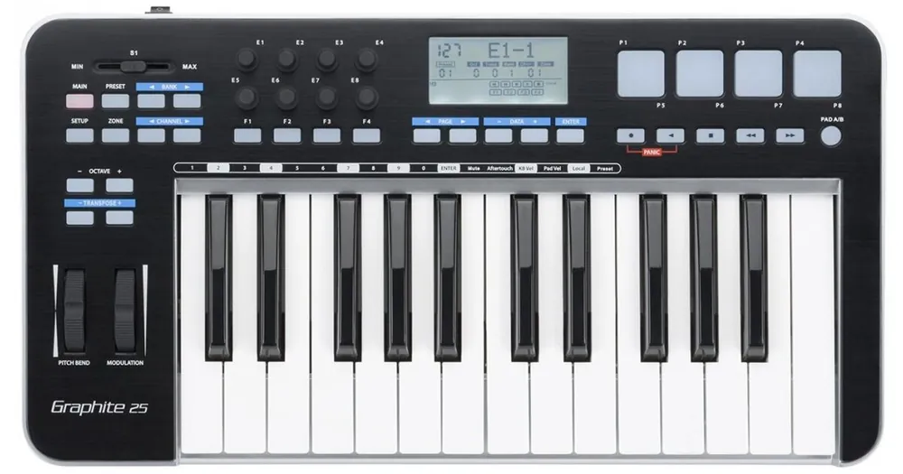 master keyboard, 25 polovyvážených kláves, aftertouch, 9 tlačítek, 8 nekonečných knobů, 4 pady, transportní tlačítka, velký podsvícený displej, vstup pro sustain pedál, MIDI OUT, USB, v ceně SW Native Instruments Komplete Elements
