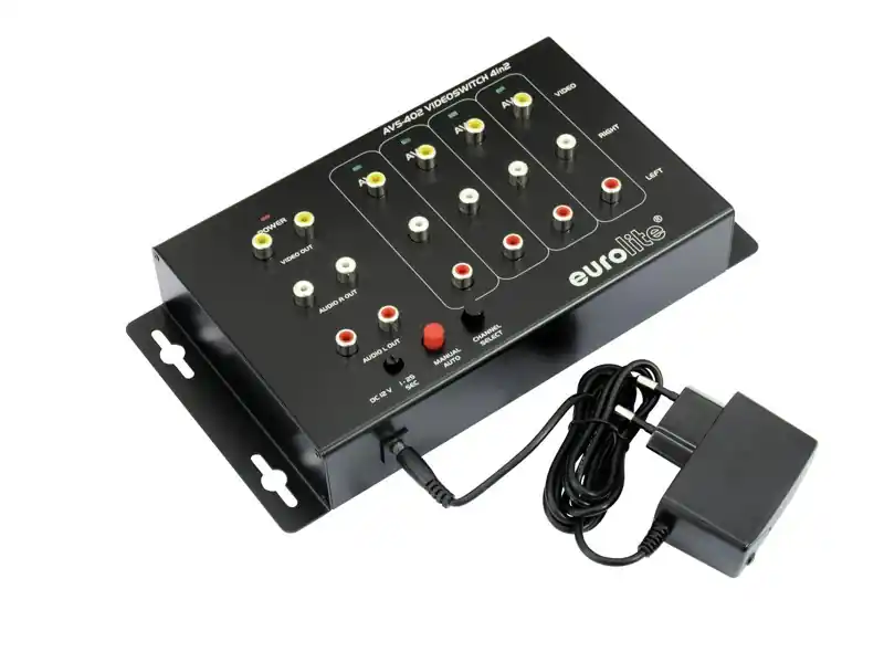 Eurolite AVS-402 video přepínač, 4-pásmový. Pro přepínání čtyř AV zdrojů (audio, složený video a s-video signály) do až dvou televizních monitorů. Typickými aplikacemi jsou informační a bezpečnostní systémy v obchodních centrech, školách, hotelích, nádražích, letištích atd. 4 vstupy (RCA), ručně nebo automaticky přepnutelné. Doba pro automatické přepínání nastavitelná mezi 1 až 25 vteřinami. 2 výstupy (RCA). Současné nahrávání do jednoho nebo dvou video nebo DVD rekordérů. Stereo systém může být zapojen pomocí druhého výstupu. 12 V napájení pomocí přiloženého adaptéru.