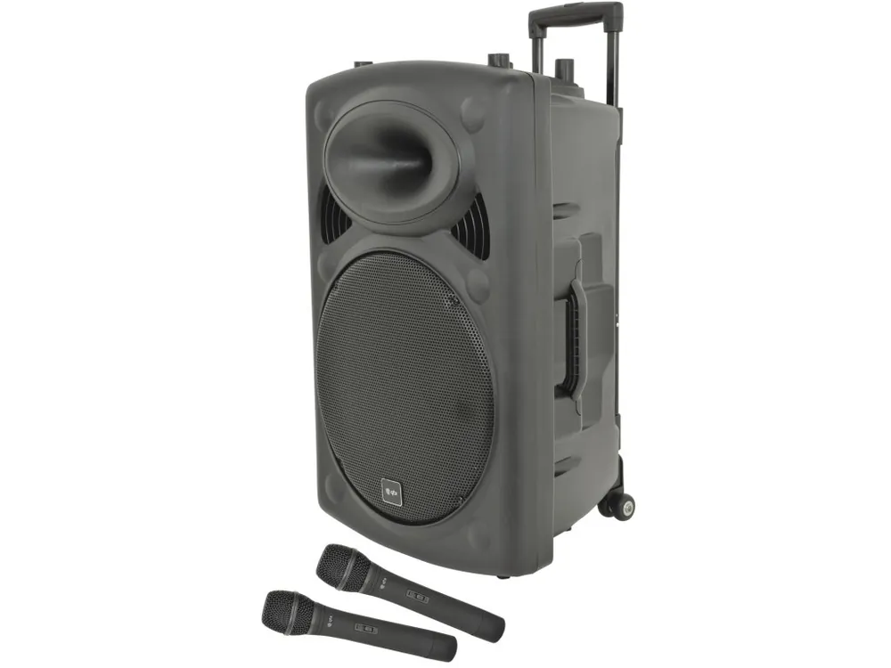 Mobilní 15″ zvukový systém, zabudovaný zesilovač s výstupním výkonem 50W + 50W max. Napájení volitelně ze sítě 220-240V AC 50Hz (IEC), 12/15V DC 3A nebo pomocí zabudovaného dobíjecího 12V akumulátoru s výdrží až 8 hodin. Integrovaný MP3 přehrávač, přijímač Bluetooth 4.0, SD/MMC slot, USB port, FM přehrávač, 2x bezdrátový VHF ruční mikrofon (174,1 MHz + 175,0 MHz), IR dálkový ovladač, ovládací panel MP3 přehrávače s displejem, linkový vstup 2x RCA (L+R), linkový výstup 2x RCA, vstup aux stereo mini jack 3,5 mm, vstup Jack 6,3 mm pro mikrofon/kytaru, vstup Jack 6,3 mm pro mikrofon se samostatnou regulací hlasitosti a Echo efektem, regulace výstupní hlasitosti systému, regulace basů, výšek, oddělená regulace hlasitosti bezdrátových mikrofonů, přepínatelná funkce VCV talkover. Robustní plastové provedení, boční madla, výsuvná rukojeť, kolečka ve spodní části. Ideální pro domácí zábavu, oslavy a párty, prezentace a výstavy apod.