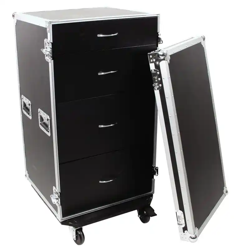 Univerzální zásuvkový case ODS-1 s kolečky – profesionální transportní case. 4 zásuvky (2 x 7 U, 1 x 5 U, 1 x 3 U). Vnitřek vypolstrován černou plstí. Vysoce kvalitní zpracování z 9 mm široké překližky (vícevrstvá, lepená), černé laminování. Hliníkové profilové rámy (30 mm) se zaoblenými okraji. Chromované rohy, zámky a držadla. 3-ramenné, velké ocelové rohy. Součástí dodávky je 18 mm deska se 4 kolečky, z nichž 2 jsou opatřeny brzdami. 4 uzamykatelné motýlkové zámky, dodávané s 2 klíči. 4 sklopná držadla.