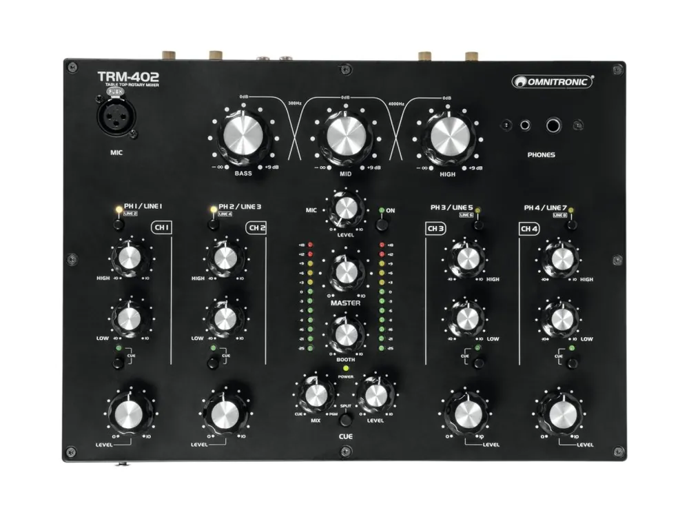 Klasický 4-kanálový mixážní DJ pult s rotačními potenciometry. 3-pásmový frekvenční izolátor pro oddělení basů, středů a výšek. Pult je osazen kvalitními ALPS potenciometry (Blue Velvet RK27). Funkce Gain, 2-pásmový ekvalizér (výšky/basy) a možnost volby vstupního signálu Phono/Line pro každý kanál. Mikrofonní XLR vstup s vlastním ovládáním hlasitosti. Možnost odposlechu vstupních kanálů a master výstupu přes sluchátkový výstup Jack 6,3 mm nebo Jack 3,5 mm. Stereo LED indikace úrovně výstupního signálu Master. 4x RCA vstup Phono s regulací vstupní citlivosti signálu, 8x RCA vstup Line. Master výstup XLR/RCA, Booth výstup XLR/RCA a Record výstup RCA.