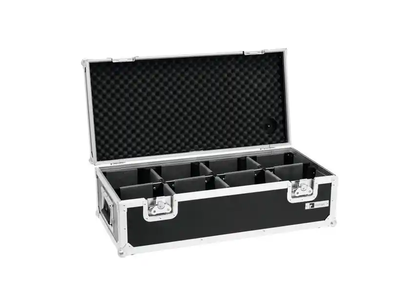 Fitted for eight EUROLITE AKKU UP-4. High-quality workmanship with 7 mm birch multiplex, dark brown laminated. Aluminum profile frames with rounded edges. Interior upholstered with foam. Three-leg, big steel ball corners. Cable conduit allows recharging the devicex inside the case. 1 chrome butterfly lock (Adam Hall). 1 chrome case handles (Adam Hall). 4 rubber feet. Made in Europe.