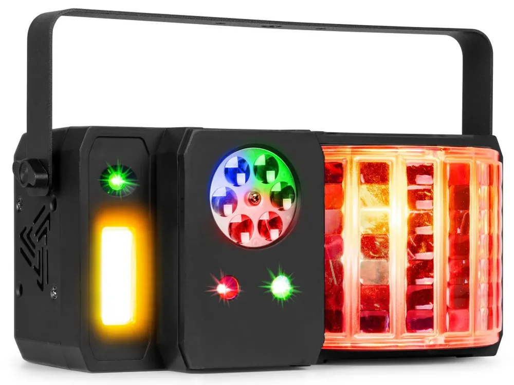 – 5v1 efekt s gobo projektorem, LED butterfly efektem, stroboskopem a double pattern laserem