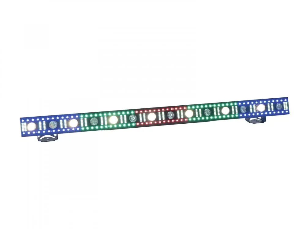 Světelná lišta se třemi LED efekty v jednom zařízení, paprskový efekt 14x LED 3W WW (teplá bílá) s úhlem paprsku 6,5°, stroboskop 180x LED SMD CW (studená bílá), ambientní osvětlení 120x LED SMD 5050 TCL RGB, všechny LED jsou umístěny v různých segmentech, které lze ovládat jednotlivě pomocí DMX (2, 6, 34 nebo 37 kanálů), v režimu Master / Slave, automaticky, nebo pomocí vestavěného mikrofonu s nastavitelnou citlivostí, přímý výběr z deseti přednastavených barev, plynulé míchání barev RGB, stmívání a stroboskopický efekt s proměnnou rychlostí a náhodným výběrem, adresování a nastavení pomocí ovládacího panelu se čtyřmístným LED displejem. Lišta je opatřena dvěma otočnými držáky pro zavěšení na zeď nebo na konstrukci. Bezhlučný provoz díky pasivnímu konvekčnímu chlazení, vstup a výstup konektory Power Con s možností napájení až 8 dalších zařízení.