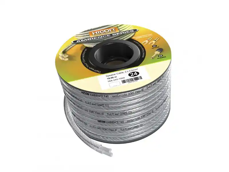 HICON Hifi reproduktorový kabel nabízí vynikající kvalitu zvuku a příznivou cenu. Vnější rozměry 4×8,5 mm, vodiče 2x4mm s parametry 2x511x0,10mm postříbřené, kapacita 55pF na 1m. Délka 20m.