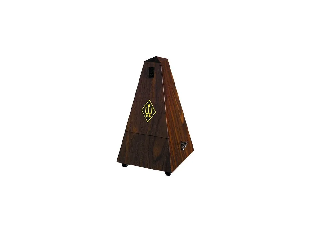 Mechanický metronom Wittner v klasickém provedení ve tvaru pyramidy. Plastový kryt zhotovený jako imitace pravého dřeva.