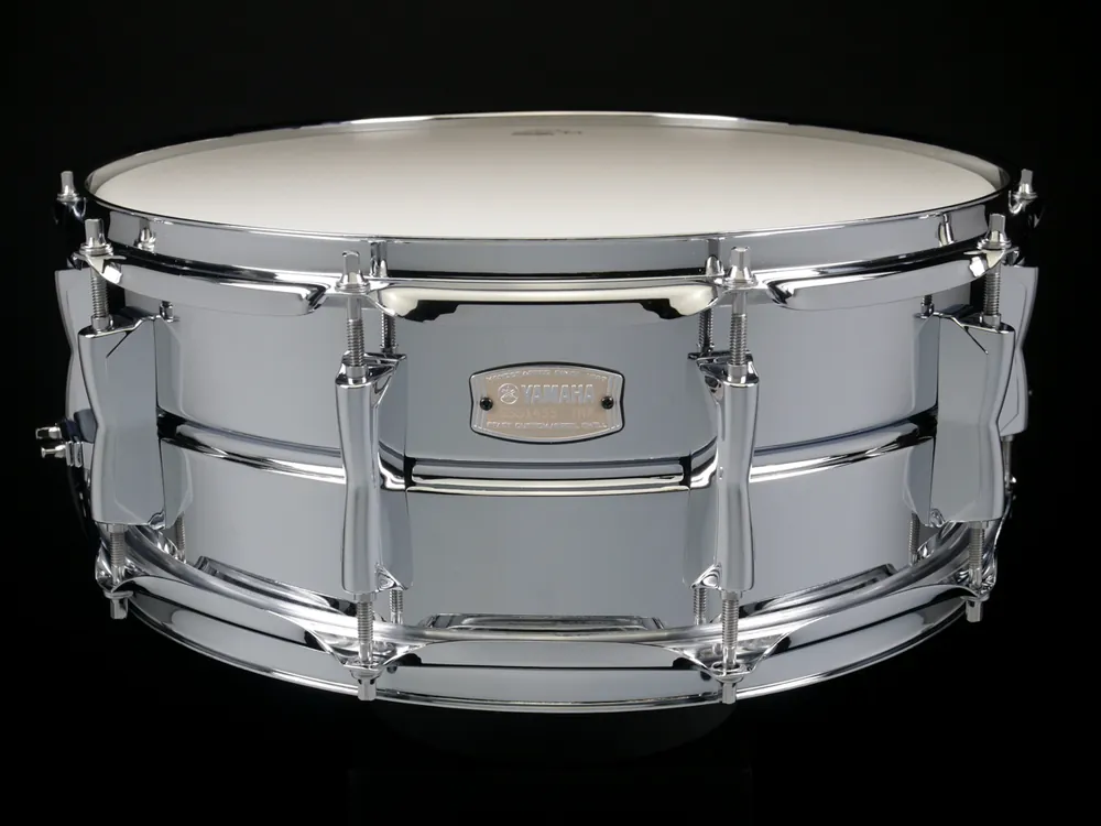 YAMAHA Stage Custom Steel– bubínek je vyrobený z ocelového korpusu o síle stěny 1 mm, obruče jsou 1,5mm silné 3x ohýbané a nesou deset otvorů pro ladící šrouby, mušle jsou středové, oboustranné, strunění je vyrobeno z vysoce karbonové oceli a má 20 pružin, mechanika strunění je model B-9 (napínací část) a DC (upínací část). Snare je z výroby osazen převozními blánami Remo UT coated/clear.