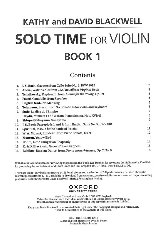 „Solo Time for Violin“ je třídílná série koncertních skladeb pro housle a klavír. První díl série je zaměřen na mírně až středně pokročilé houslisty. Sešit obsahuje 16 koncertních skladeb různých hudebních stylů, od baroka až po současnost. Repertoár zahrnuje originální skladby i úpravy známějších melodií, které pomáhají houslistům rozvíjet techniku hry a hudební výraz. Součástí sešitu je adresa internetových stránek, na kterých si můžete stáhnout klavírní doprovody pro všechny skladby a demo nahrávky pro vybrané skladby.