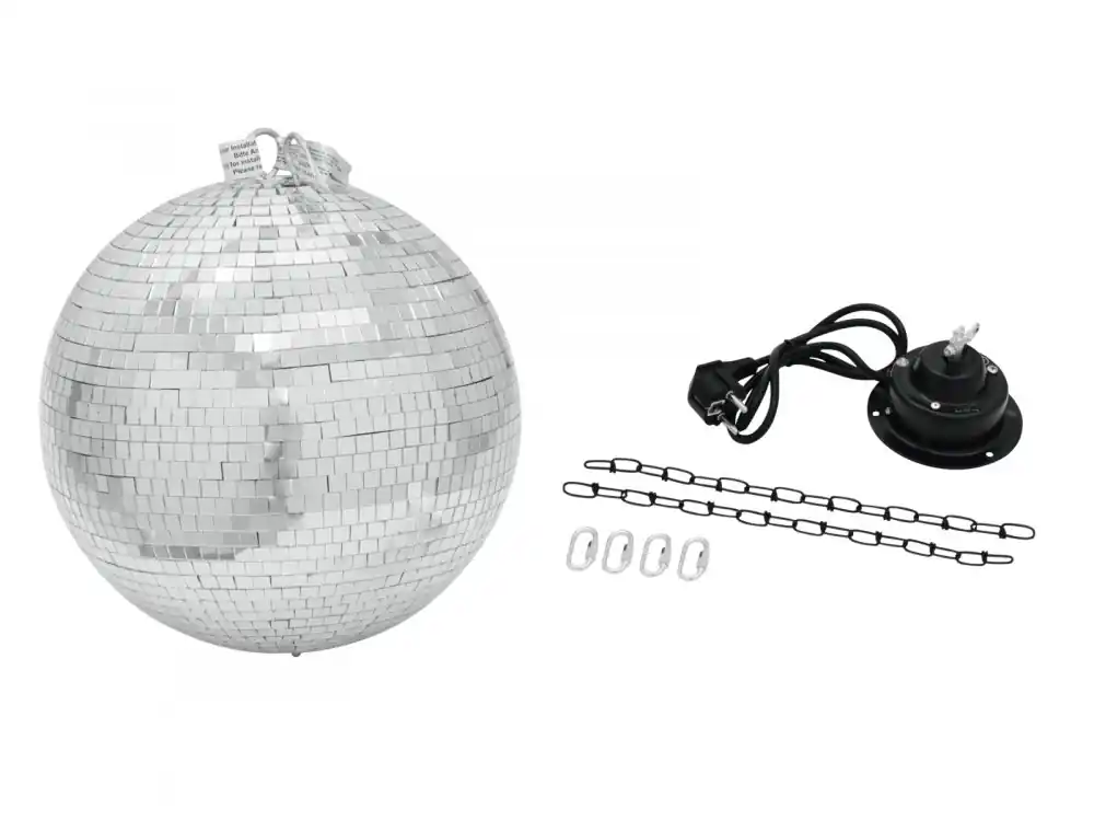 Sady obsahují zrcadlovou kouli v různých průměrech, motorek 1,5 otáčky/min. řetěz k upevnění koule. Ideální dekorace pro noční kluby, bary a restaurace.